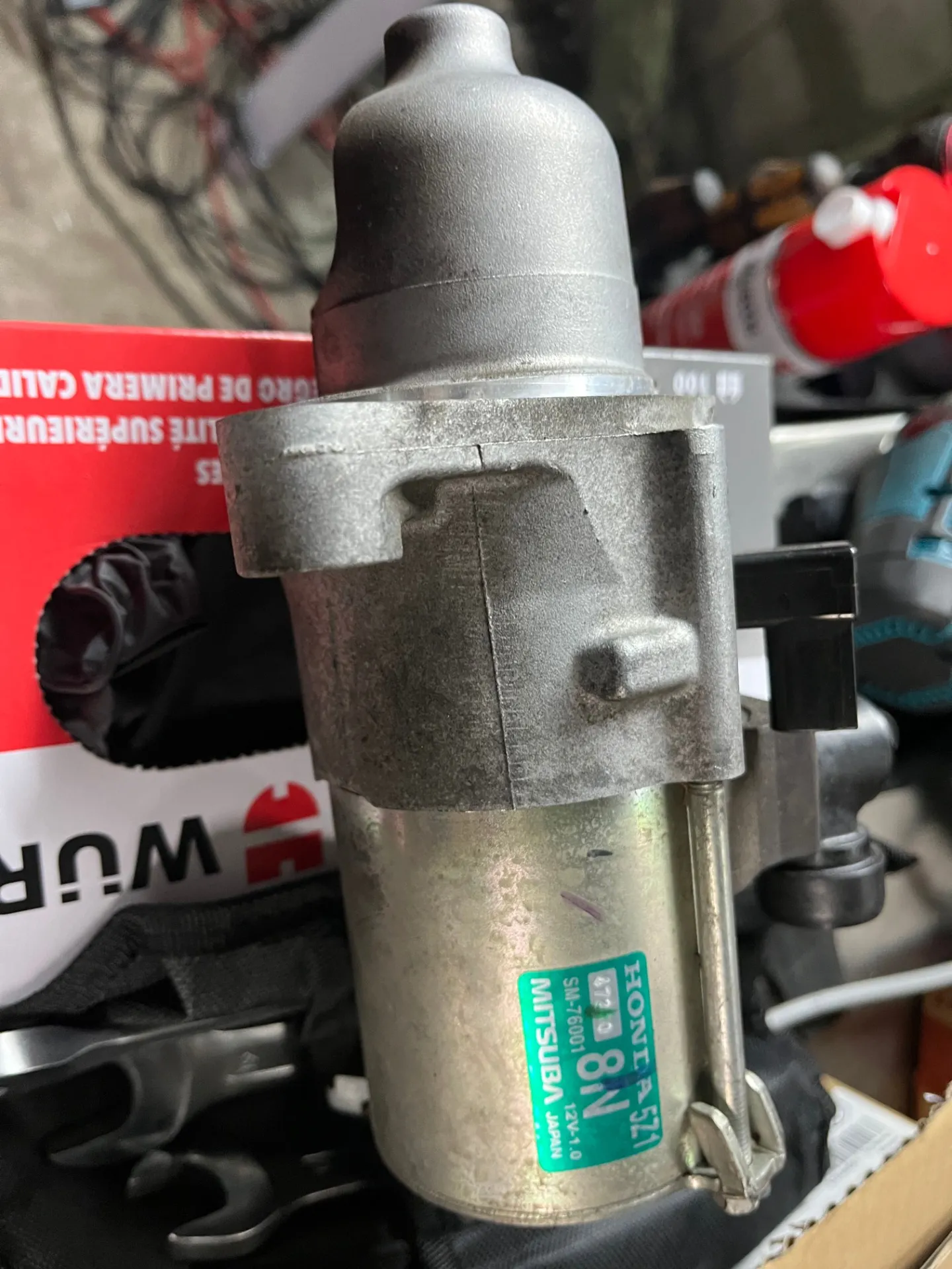 かぎを回してもうんともすんとも言わないのでバッテリーかスターターかな?とおもいまずバッテリー電圧をみたら正常。ということでセルモーター外して点検!と思ったら下のボルトのねじ山がかじって回らない!!無理やり外しにかかるとボルトが折れてしまうので慎重に慎重にゆっくり回しては戻しを繰り返しようやく外してセルモーターの単体点検をすると動かない!ということでセルモーターを注文して交換しました。取り付け時にかじったねじ山の修正とボルトの修正もしてしっかり固定してエンジン始動してみると元気に一発始動!スムーズにいけば1時間程度の作業時間で完了します。