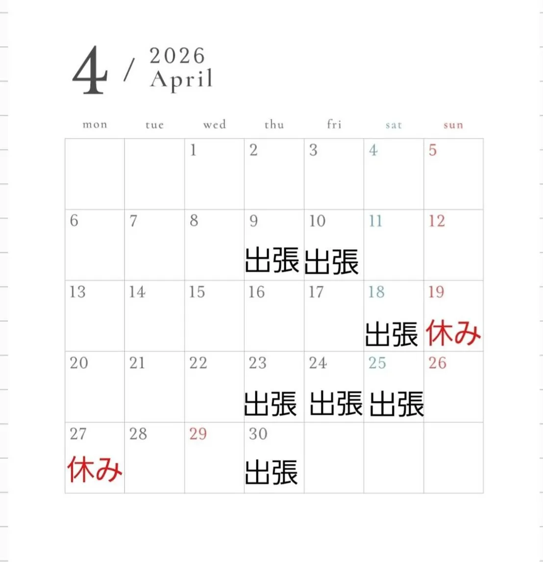 早いものでもう4月ですね😳新年度も頑張って行きたいと思います... 2026/04/05 早いものでもう4月ですね😳新年度も頑張って行きたいと思います🫡さて、4月の出張の予定です。 4月は割と出張少なめで工場で作業してることが多いのでお気軽にお問い合わせ下さい🙇 #大阪市整備工場 #新年度 #車検予約 #車修理